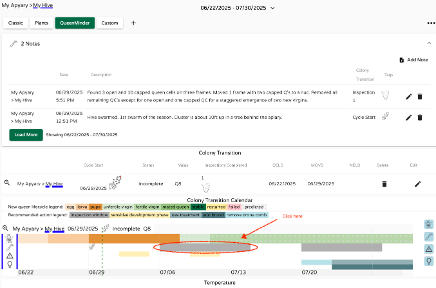 Op elk moment kunt u het QueenMinder dashboard openen om toegang te krijgen tot het tijdsverloop van de ontwikkeling van de nieuwe koningin samen met alle andere details, inspectieaanbevelingen, waarschuwingen en mogelijkheden. U moet mogelijk het weergavevenster uitbreiden om alles te zien. De bovenste aantekeningen sectie toont de gedetailleerde informatie die is ingevoerd. Beweeg over de verschillende gekleurde regio's in de Colony Transition Calendar om de betekenis van elk ervan te onthullen. De grijze inspectiebalken zijn aanklikbaar en openen het bijbehorende inspectiegegevens invoerveld.
