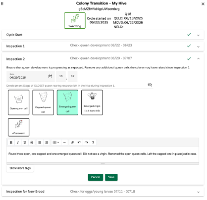Inspectie na zwermen 1: Op de dag van of de dag na de zwerm om een overmatig aantal koninginnencellen te verwijderen om nazonen te voorkomen en om het ontwikkelingsstadium van de nieuwe koningin te bepalen. Deze inspectie is optioneel. Klik op "Annuleren" als deze niet is uitgevoerd.