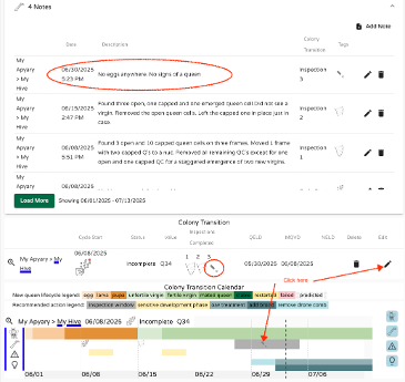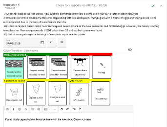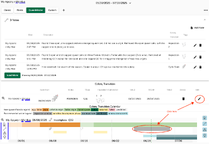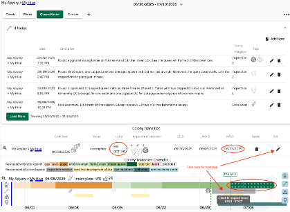 Ga terug naar het QueenMinder dashboard tegen de tijd dat het volgende inspectievenster nadert en voer de korfinspectie uit. Klik op de grijze inspectiebalk in de tijdlijn of op het bewerkpotlood in de Colony Transition samenvatting om de bevindingen in te voeren.
