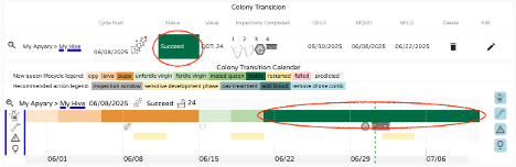 Terug bij de Colony Transition samenvatting zien we nu dat de cyclus succesvol is voltooid. Het laatste stadium van de koninginnenontwikkelingstijdlijn is solide groen geworden als indicatie dat we nu weer een stabiele broedproductie hebben.