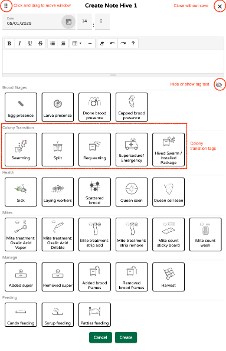 Når du klikker på den grå inspeksjonsboksen, åpnes dataregistreringsvinduet en siste gang for å avslutte syklusen. "Egg" og "Larver" valgene er ikke lenger tilgjengelige siden det forventes at den eldste brodden er forseglet nå. I vårt eksempel fant vi forseglet brod på 1 ramme og vi klikker på den tilsvarende koden. Klikk på "Opprett" for å lagre og lukke vinduet.