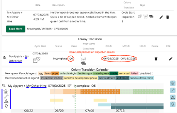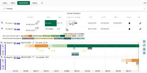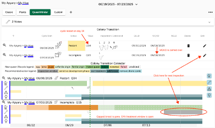 Når som helst kan du åpne QueenMinder dashboardet for å få tilgang til tidslinjen for utviklingen av den nye dronningen sammen med alle andre detaljer, inspeksjonsanbefalinger, advarsler og muligheter. Du må kanskje utvide visningsvinduet for å se alt. Seksjonen med notater øverst viser den detaljerte informasjonen som er skrevet inn. Hold musepekeren over de ulike fargede regionene i Koloniovergangskalenderen for å avdekke betydningen av hver. De grå inspeksjonsbjelkene er klikkbare og åpner de respektive inspeksjonsdatafeltene.
