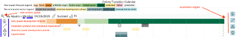 Koloniens Overgangskalender består av 4 rader som visualiserer: - Utviklingstidslinjen for den nye dronningen - Tidligere inspeksjonsresultater og anbefalte fremtidige inspeksjonsdatoer - Sensitive dronningutviklingsperioder - Muligheter for birøkteren (fjerning av dronekam, OA-behandling, tilføying av yngel for å forhindre leggende arbeidere)