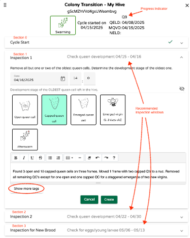 Før vi fortsetter med vårt eksempel, la oss kort se på alle seksjonene/inspeksjonene i det ovennevnte vinduet. Seksjon 0 viser sammendraget av syklusen med startdato, syklusfremdriftsindikatoren (Q-kode), Dronningens Eggleggingsdato (QELD) og Mor Dronningens Forsvinning Dato (MQVD). Disse verdiene beregnes med standardverdier for "Sverming" syklustypen og oppdateres når inspeksjonsresultater blir tilgjengelige. Standardverdiene er: