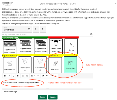 Når du klikker på den grå inspeksjonsboksen, åpnes et vindu for dataregistrering på nytt til riktig seksjon. Det skjer mye på dette punktet. La oss gå gjennom dem én etter én. I eksempelet vårt er vi på dag 32 av dronningens utviklingssyklus, som indikert av Q32-koden øverst. Vi har fullført starten på syklusen og de to første inspeksjonene som indikert ved avkryssingene. "Inspeksjon for ny Broy" kodene har følgende grupperinger og betydninger: