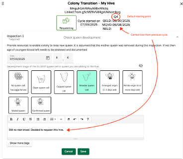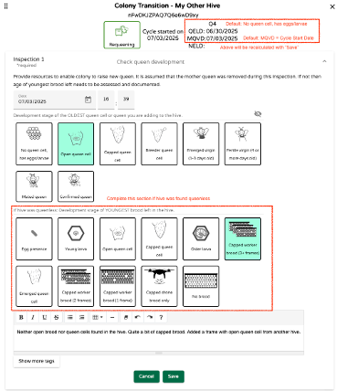 For å fortsette med eksemplet vårt, anta at det er tid for neste inspeksjon. Klikk på den første grå inspeksjonsbjelken. Dette vil åpne dataregistreringsvinduet for neste inspeksjon. Denne gangen åpnes dialogen med dataregistreringsvinduet for den andre inspeksjonen. Velg igjen utviklingsstadiet til den eldste dronningcellen (eller klekkede jomfruen) og fjern eventuelle ekstra dronningceller som kan ha blitt oppfostret siden forrige inspeksjon.