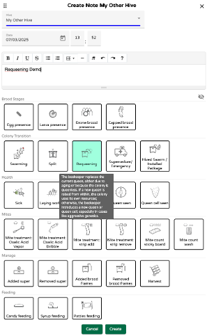 Desse funksjonane er førebels berre tilgjengelege på MyBroodMinder-nettplattformen. Implementering i Bienes mobilapp vil kome i ein andre fase.